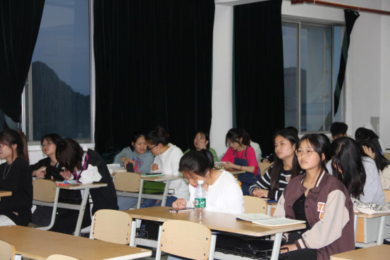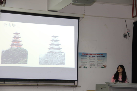朱伦银对家乡贵州省黔南布依族苗族自治州贵定县进行了介绍。从地理位置、美食文化、风景名胜、历史文化四个方面进行了介绍。丰富的贵定小吃,让同学们先从味蕾上感受了贵定美食之美。金山塔、阳宝山、盘江镇、四季花谷、云雾镇、云雾大桥以及马滩瀑布,在这些特色鲜明的景点中,贵定的人文之美也得到了体现。在她给同学们播放的视频中,展示了一个文化多元的贵定。