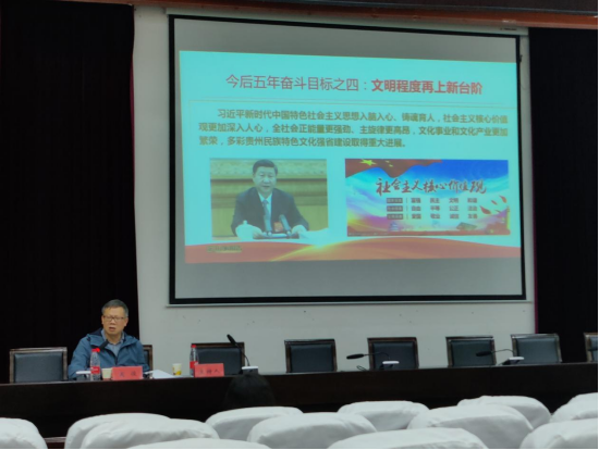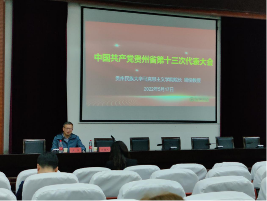 为深入学习贯彻落实中国共产党贵州省第十三次代表大会精神。437必赢国际线路马克思主义学院、437必赢国际线路、社会学院、音乐舞蹈学院各支部党员于2022年5月17日晚上19:30在15栋教学楼圆形会议室开展2022年上半年党员培训班第三次党课学习。本次会议由马克思主义学院院长周俊同志进行授课,授课内容为学习贵州省第十三次党代会精神。