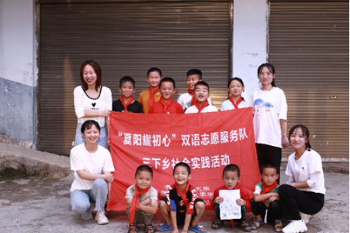 7月21日,437必赢国际线路“夏阳耀初心”双语志愿服务小队在凯里市舟溪镇新光村向“大中小学”的少先队员宣传中国共产党知识以及普通话的推广。