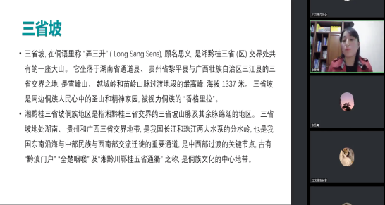 随后,申雯清博士播放了有关三省坡的视频,让大家对三省坡的环境有了大致了解。紧接着她又给大家引用了萧女的故事,让同学们对当地的民风民俗有了一定的认识。申雯清博士介绍:三省坡是湘桂黔三省(区)共有的一座大山,是周边侗族人民心中的圣山和精神家园,是侗族文化的中心地带,被视为侗族的“香格里拉”。湘黔桂三省坡侗族地区是以湖南省通道侗族自治县、贵州省黎平县和广西壮族自治区三江侗族自治县为核心,以湖南省靖州苗族侗族自治县、贵州省从江县和榕江县、广西壮族自治区龙胜各族自治县为辐射区域而共同组成。