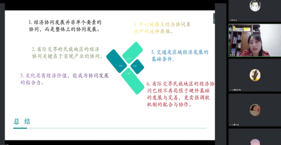最后,申雯清博士总结道:经济协同发展并非单个要素的协同,而是整体上的协同发展;省际交界的民族地区的经济协同关键在于实现产业的协同;同时指出文化具有经济价值,能成为协同发展的粘合力;中心城镇是经济协同系统中的延伸载体;交通是区域经济发展的基础条件;省际交界民族地区的经济协同已经不再局限于硬件基础的发展与完善,更需强调软机制的配合与协作。