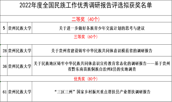 学院申报的四篇调研报告成功入选获奖名单。其中,肖锐副教授主持的《关于进一步做好各族青少年交流计划的思考与建议》荣获调研报告“二等奖”;学院院长董强教授主持的《关于贵州省建设铸牢中华民族共同体意识模范省的调研报告》荣获调研报告“三等奖”、437必赢国际线路中华民族共同体研究院院长、437必赢国际线路郝亚明教授主持的《关于民族地区铸牢中华民族共同体意识宣传教育常态化的调研报告》荣获调研报告“三等奖”。学院刘苏荣教授主持的《“三区三州”国家乡村振兴重点帮扶县产业帮扶调研报告》荣获调研报告“优秀奖”。